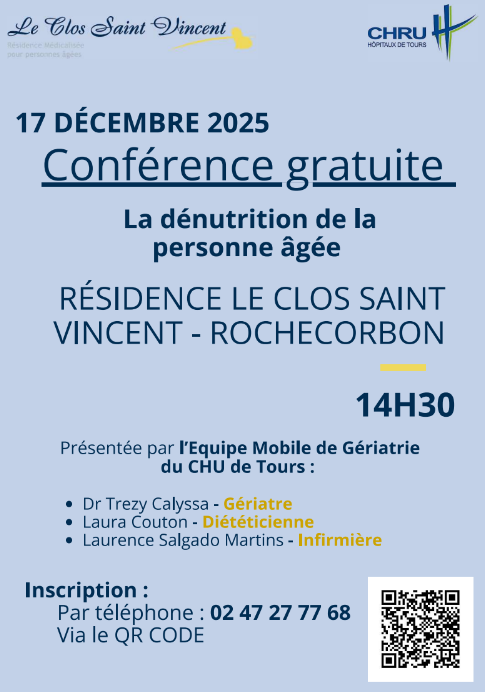 Le mercredi 17 décembre 2025 à 14h30, la Résidence Le Clos Saint Vincent à Rochecorbon vous invite à une conférence animée par des professionnels du CHU de Tours. Découvrez les risques, les signes d’alerte et les solutions pour mieux accompagner vos proches. Entrée libre, ouverte à tous. Inscription avant le 12 décembre.